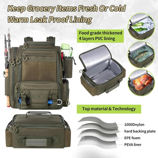 Large Fishing Backpack with Cooler for 3 Tackle boxes